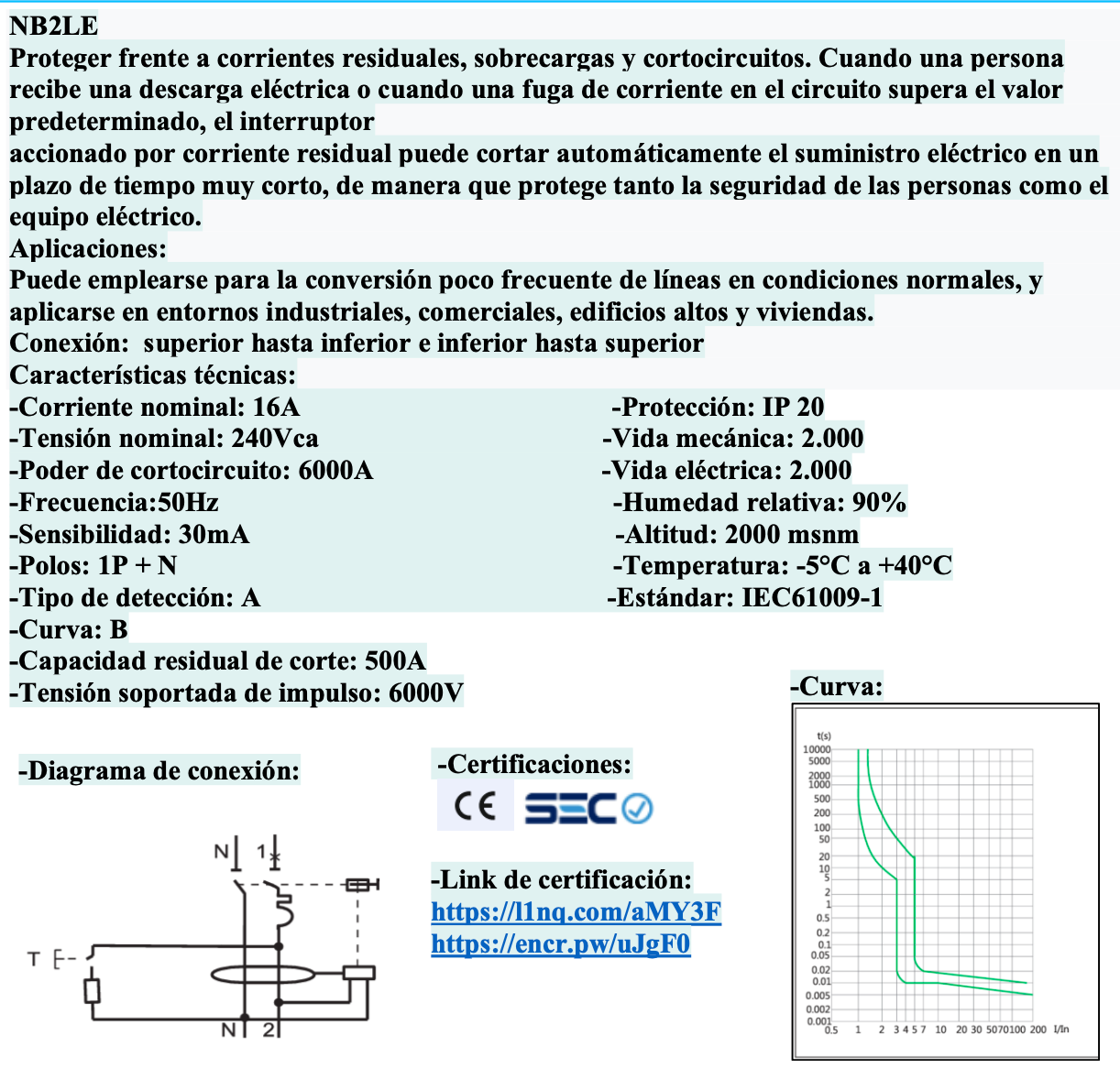 El CHINT NB2LE 1P+N 16A Curva B Tipo A 30mA combina protección magnetotérmica y diferencial en un solo dispositivo compacto. Diseñado para circuitos monofásicos, protege contra sobrecargas, cortocircuitos y fugas a tierra, ofreciendo máxima seguridad en instalaciones residenciales y comerciales. La curva B lo hace ideal para cargas resistivas (como iluminación o calefacción), mientras que el tipo A garantiza protección frente a corrientes residuales alternas y pulsantes de corriente continua. Cumple con la norma IEC/EN 61009-1.