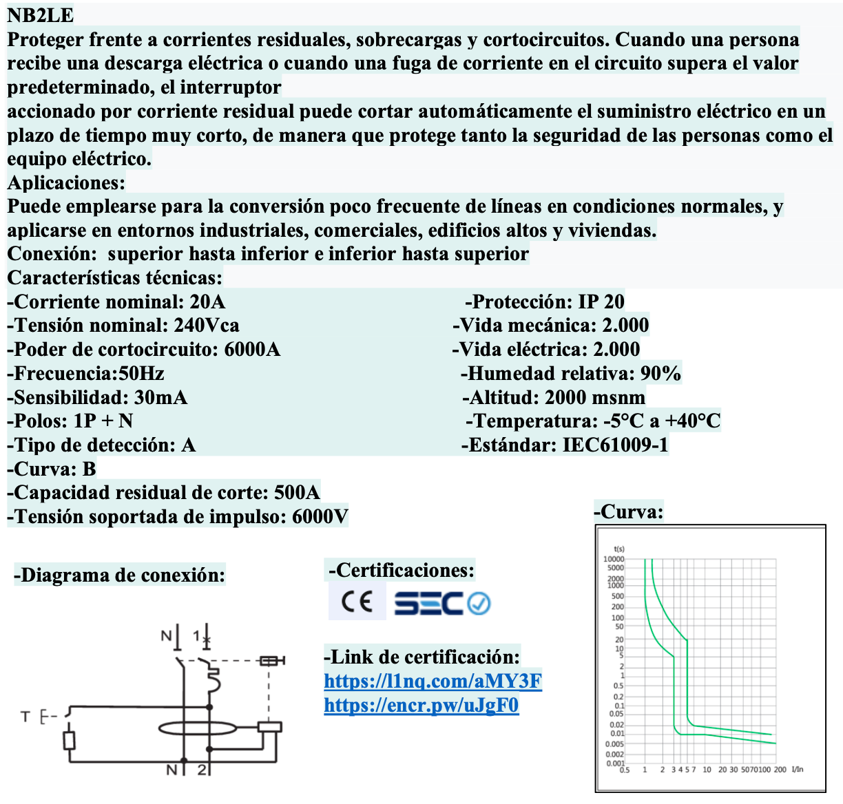 El CHINT NB2LE 1P+N 20A Curva B Tipo A 30mA es un interruptor automático diferencial que integra protección magnetotérmica y de fuga a tierra en un solo dispositivo. Diseñado para circuitos monofásicos, protege eficazmente contra sobrecargas, cortocircuitos y corrientes residuales, garantizando seguridad y continuidad en instalaciones eléctricas residenciales y comerciales. Su curva B lo hace adecuado para cargas resistivas (iluminación, calefacción), mientras que el tipo A ofrece protección frente a corrientes residuales alternas y pulsantes de corriente continua. Cumple con la norma IEC/EN 61009-1.