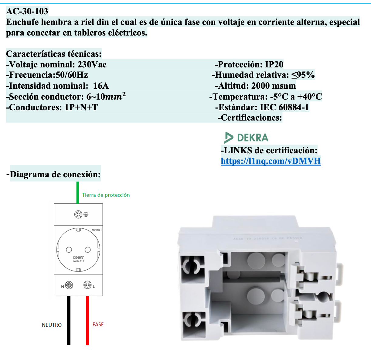| Número de polos | 2P + Tierra (Lateral/Clips) |