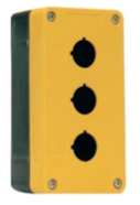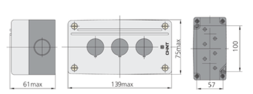 Caja NPH1‑30J de CHINT en PVC autoextinguible con grado de protección IP65. Incluye tres perforaciones Ø22 mm para montar pulsadores, selectores o indicadores. Cumple IEC/EN 60947‑5‑1, soporta hasta 10 A, tensión nominal AC 415 V/DC 250 V, y está diseñada para uso en entornos industriales o exteriores.