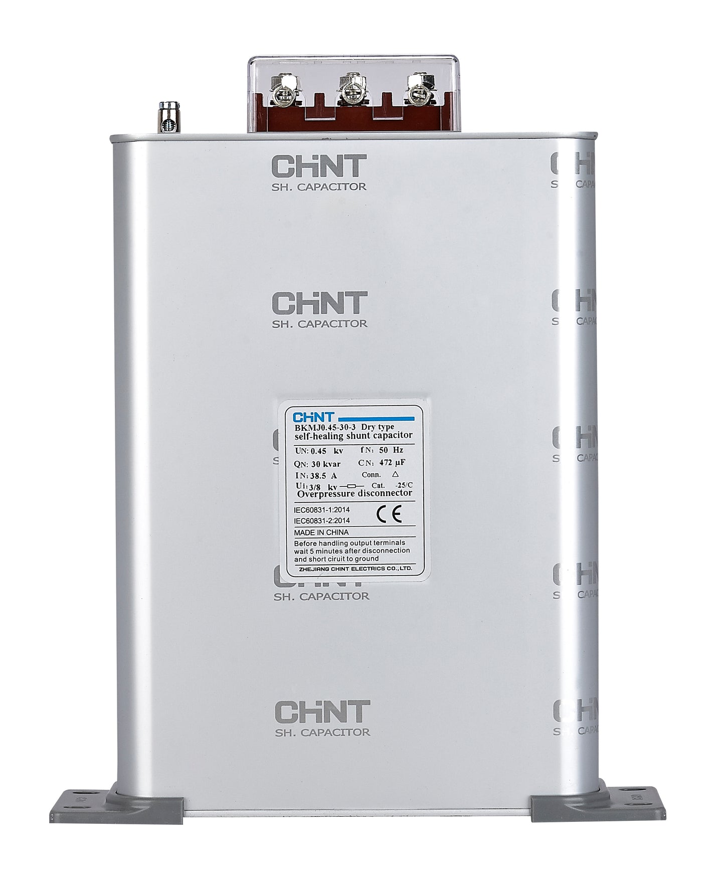Condensador trifásico CHINT tipo caja seca, modelo BKMJ-0.45-7.5-3, con potencia de 7,5 kVAR y tensión nominal de 450 V a 50 Hz. Diseñado para compensación de energía reactiva en sistemas de baja tensión, mejorando el factor de potencia y reduciendo pérdidas en instalaciones eléctricas.