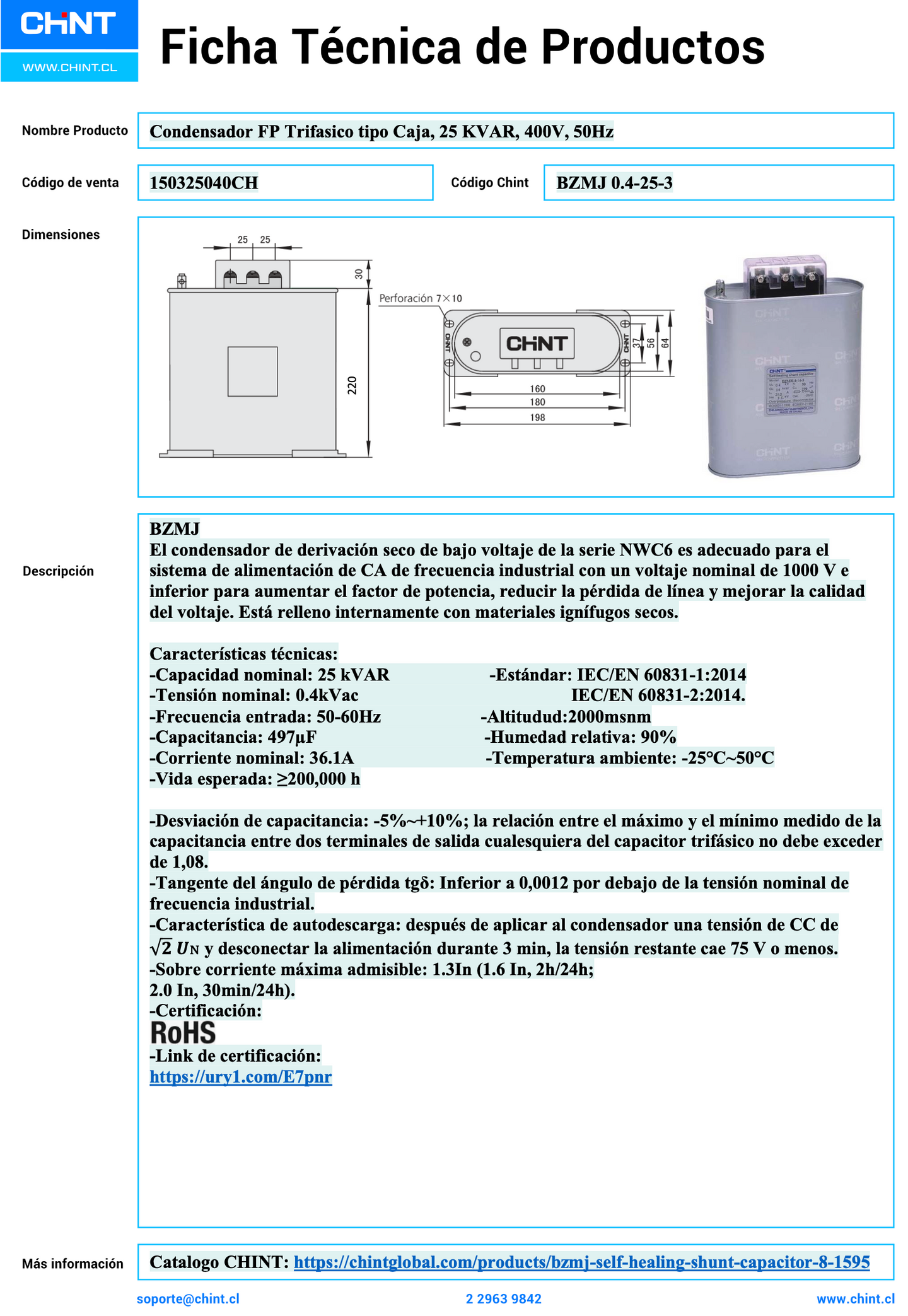 Condensador Trifásico CHINT BZMJ 25 kVAR 400 V 50 Hz – Código 150325040CH