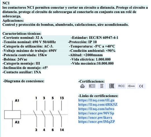 Contactor CHINT NC1-3210 trifásico de 32 A con contactos principales 3P + 1NA auxiliar, bobina de control a 24 V AC y potencia de conmutación de hasta 15 kW en categoría AC-3 (380 V). Diseñado para maniobra y control de motores eléctricos, cumpliendo norma IEC/EN 60947-4-1.