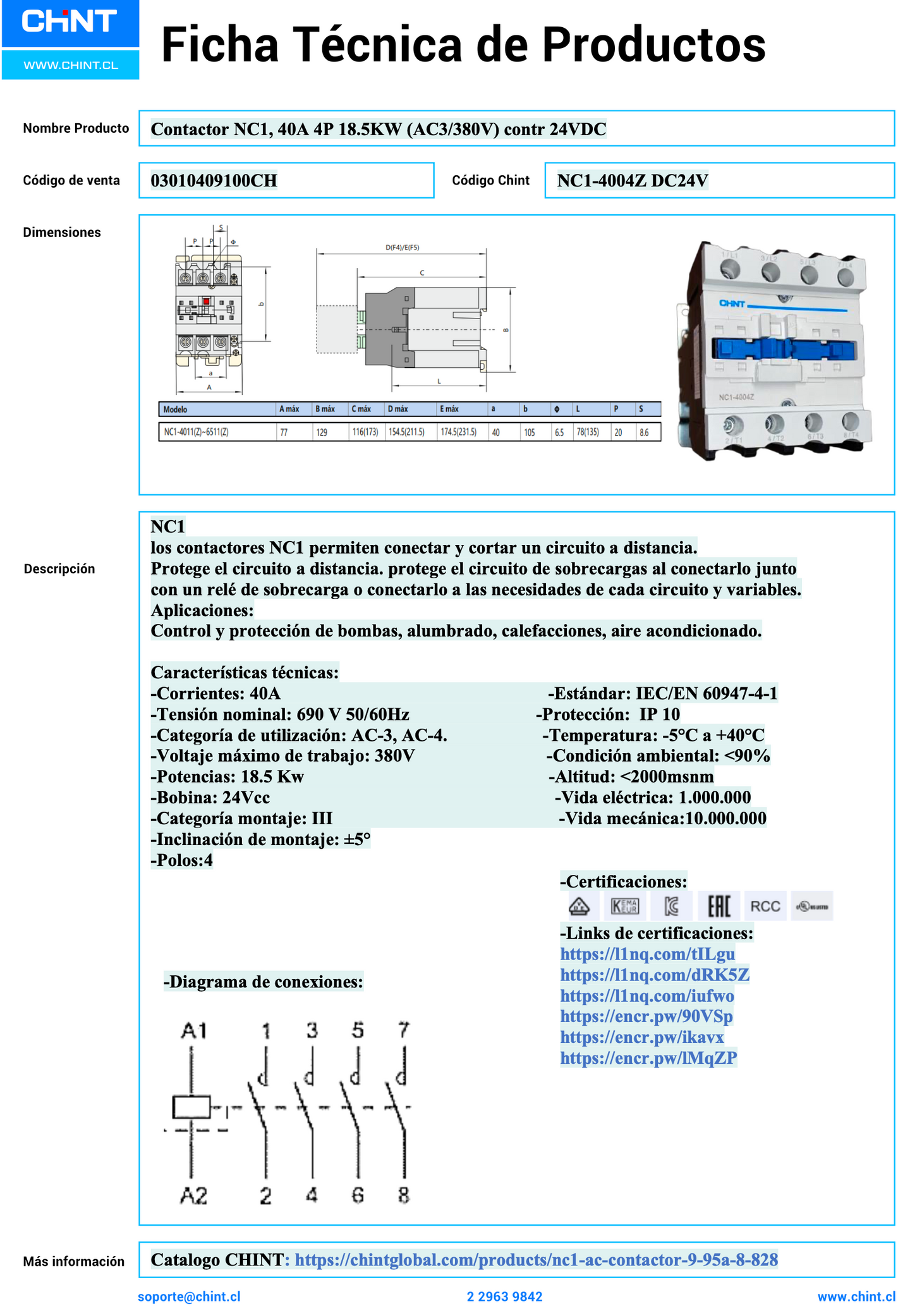 Contactor CHINT NC1-4004Z tetrapolar de 40 A, con potencia de 18,5 kW en categoría AC-3 a 380 V. Incluye bobina de control a 24 V DC, diseñado para maniobra y control confiable de motores y cargas eléctricas trifásicas.