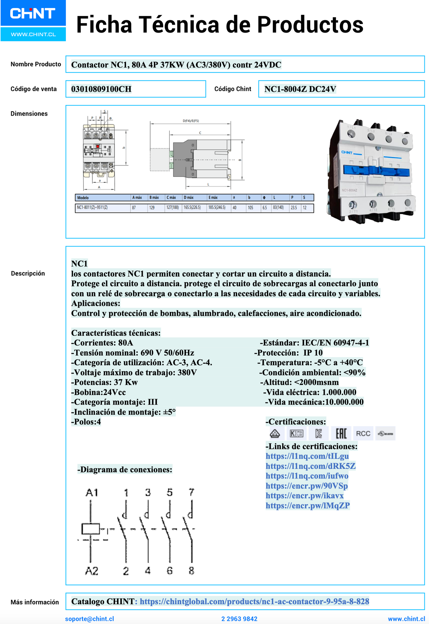 Contactor CHINT NC1-8004Z tetrapolar de 80 A, con capacidad de maniobra de motores hasta 37 kW en categoría AC3 a 380 V. Equipado con bobina de control a 24 VDC, diseñado para conmutación, arranque y control de motores en aplicaciones industriales y de automatización.