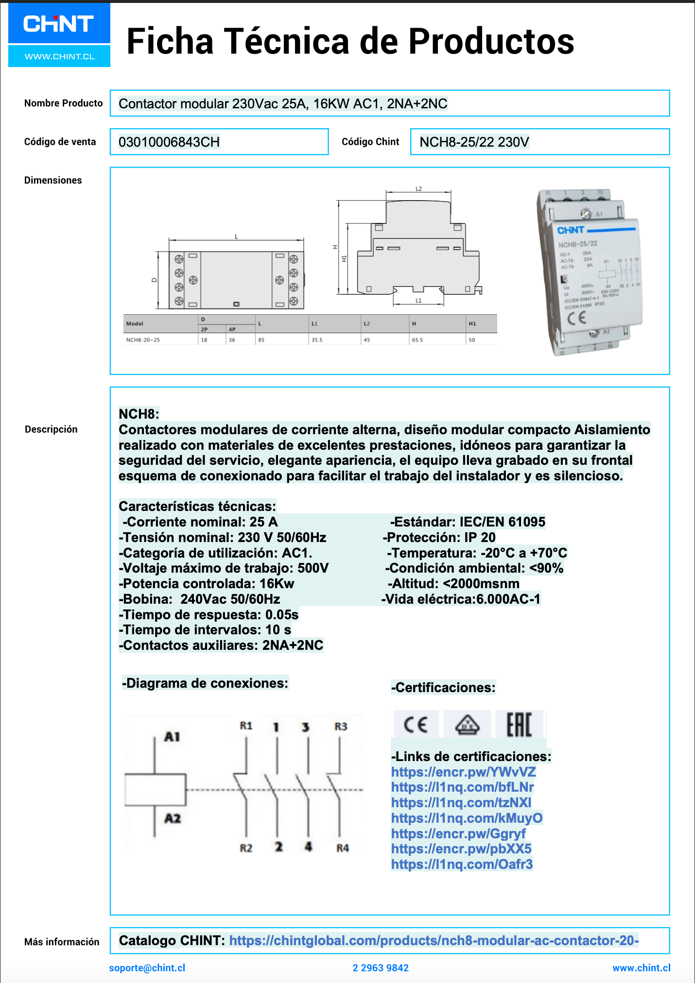 Contactor modular 230Vac 25A, 16KW AC1, 2NA más 2NC - 03010006843CH
