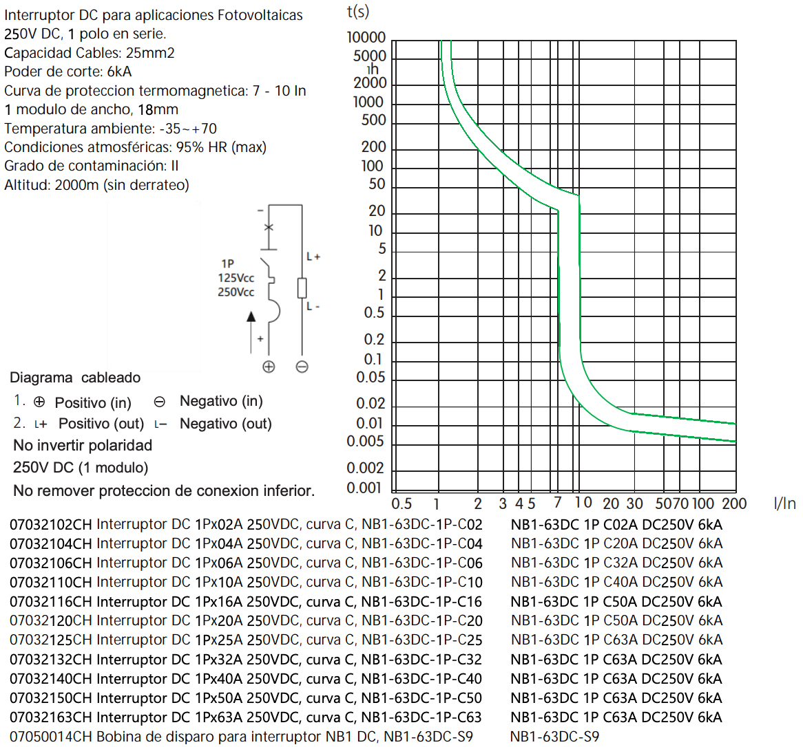 Interruptor DC CHINT modelo NB1-63DC unipolar de 2 A y 250 VDC, curva C, con capacidad de corte de 6 kA. Protege circuitos de corriente continua frente a sobrecargas y cortocircuitos en sistemas industriales y fotovoltaicos.