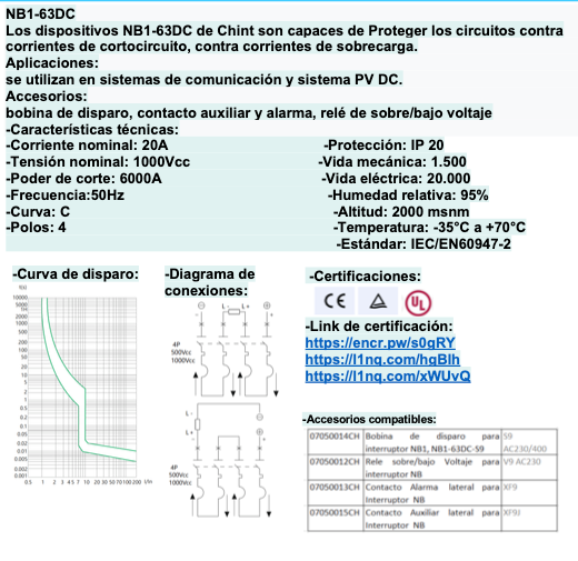 El CHINT NB1-63DC 2P 20A 1000VDC es un interruptor automático en corriente continua de curva C, diseñado para la protección de circuitos fotovoltaicos o sistemas DC de hasta 1000 V.