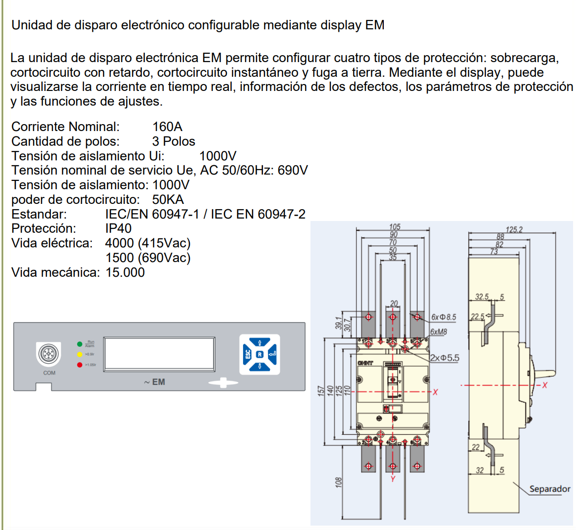 Interruptor electrónico CHINT NM8N-250S tripolar de 160 A, con ajuste electrónico 0,4–1 In y capacidad de corte de 50 kA a 415 V. Proporciona protección confiable contra sobrecargas y cortocircuitos, permitiendo un control preciso en aplicaciones industriales y comerciales.