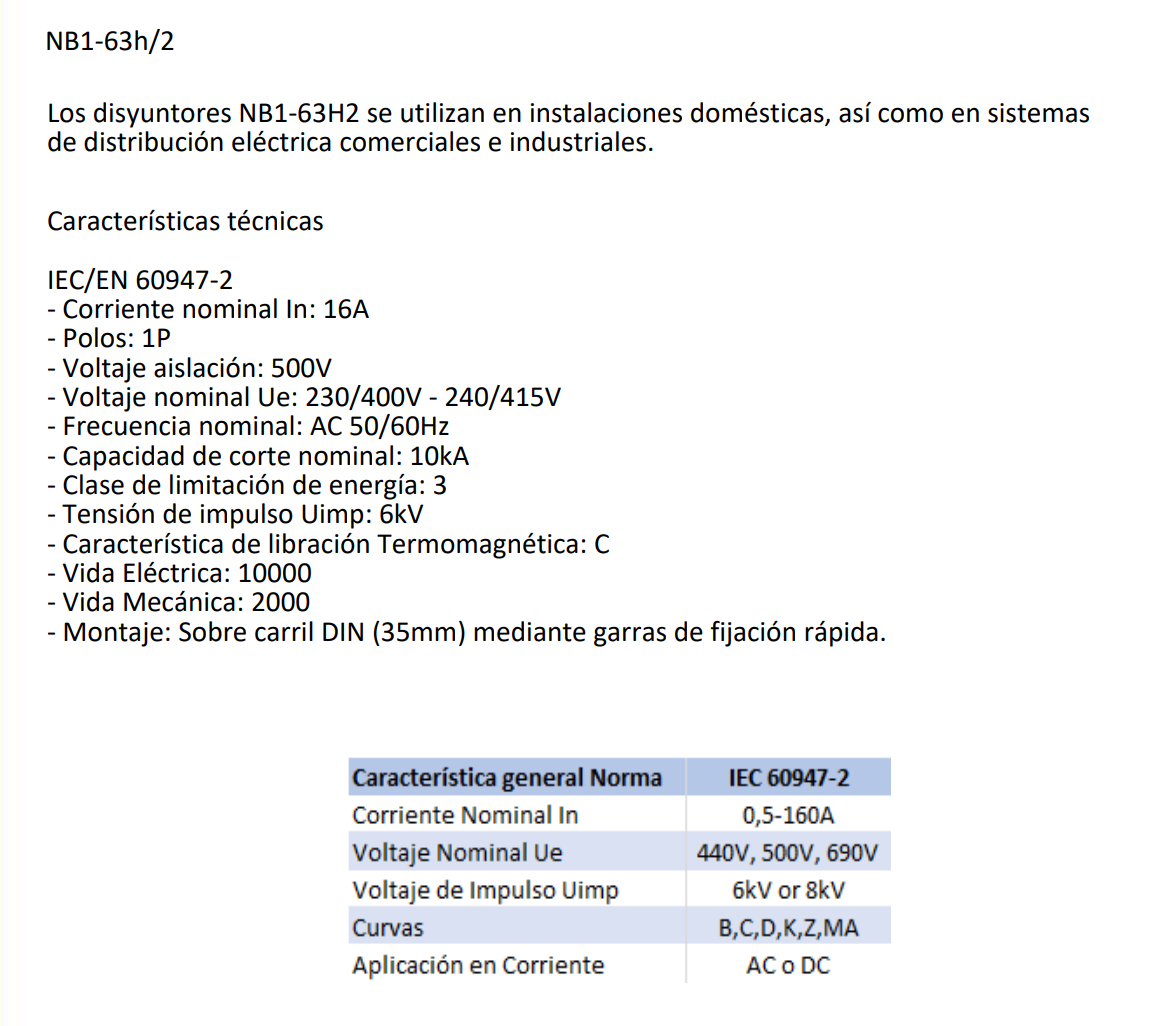 Interruptor industrial CHINT NB1-63H/2 unipolar de 16 A, curva C y capacidad de corte de 10 kA conforme a IEC 60947-2. Diseñado para proteger circuitos en entornos industriales y comerciales, ofreciendo operación confiable frente a sobrecargas y cortocircuitos. Instalación en riel DIN.