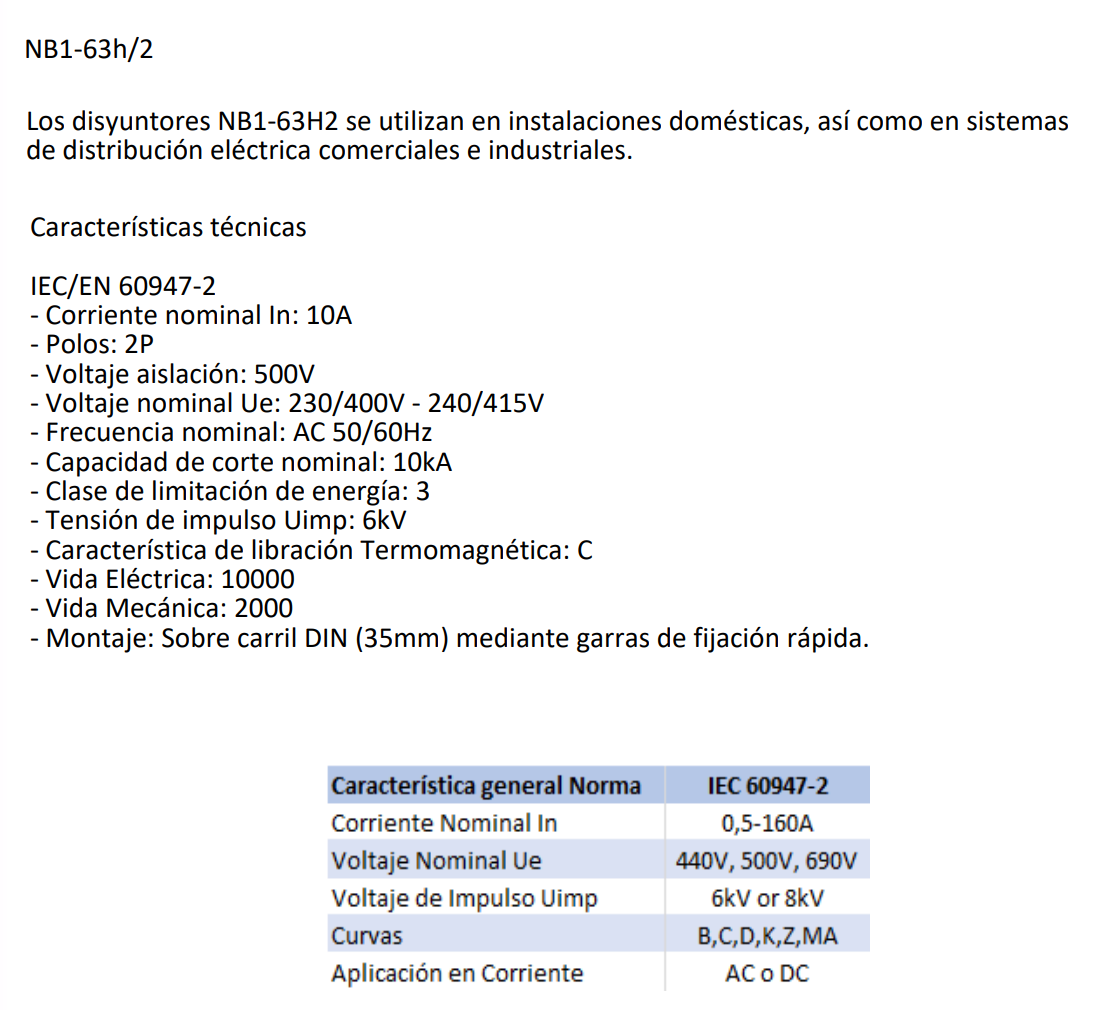 Interruptor automático industrial CHINT NB1-63H/2 bipolar de 10 A, curva C y capacidad de corte de 10 kA. Diseñado para la protección de circuitos eléctricos industriales frente a sobrecargas y cortocircuitos, conforme a la norma IEC 60947-2.