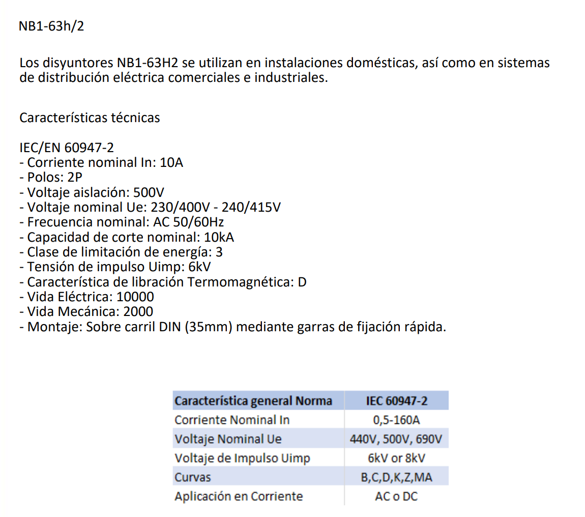 Interruptor industrial CHINT NB1-63H/2 bipolar de 10 A, curva D y capacidad de corte de 10 kA conforme a IEC 60947-2. Diseñado para la protección de circuitos con altas corrientes de arranque, proporcionando una respuesta adecuada frente a sobrecargas y cortocircuitos en aplicaciones industriales. Montaje en riel DIN.
