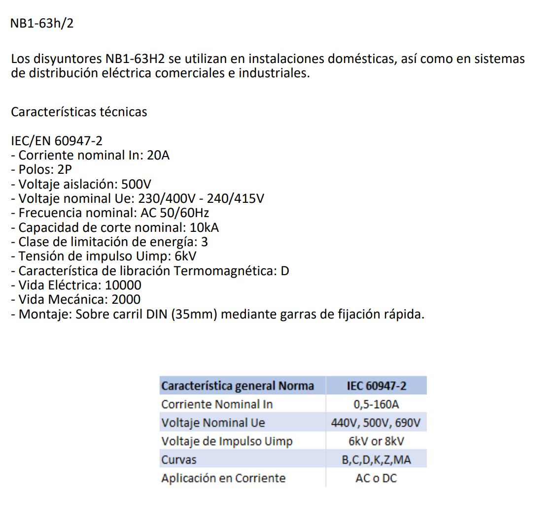 Interruptor industrial CHINT NB1-63H/2 bipolar de 20 A, curva D y capacidad de corte de 10 kA conforme a IEC 60947-2. Diseñado para la protección de circuitos con altas corrientes de arranque, garantizando una actuación adecuada frente a sobrecargas y cortocircuitos en aplicaciones industriales. Montaje en riel DIN.