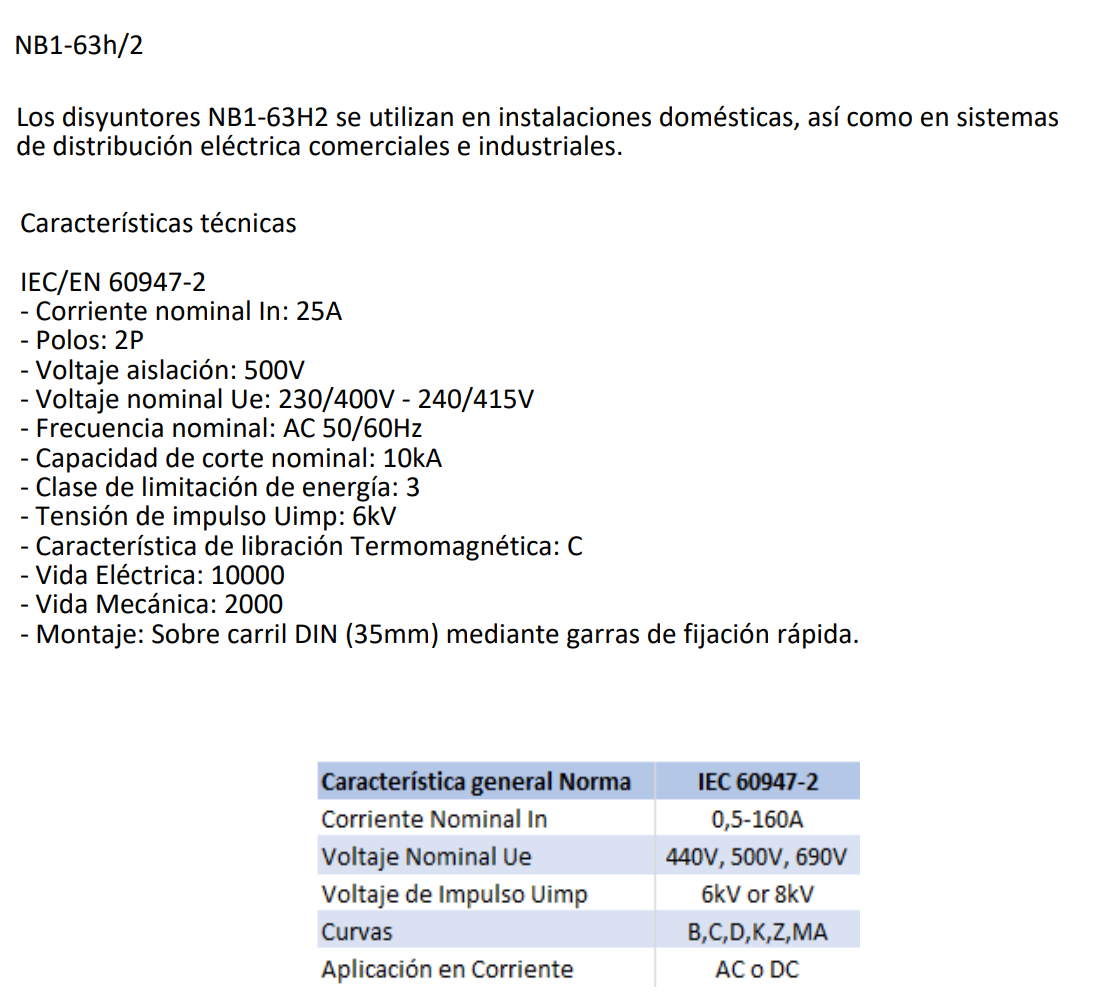 Interruptor automático industrial CHINT NB1-63H/2 bipolar de 25 A, curva C y capacidad de corte de 10 kA. Diseñado para la protección de circuitos eléctricos industriales frente a sobrecargas y cortocircuitos, conforme a la norma IEC 60947-2.