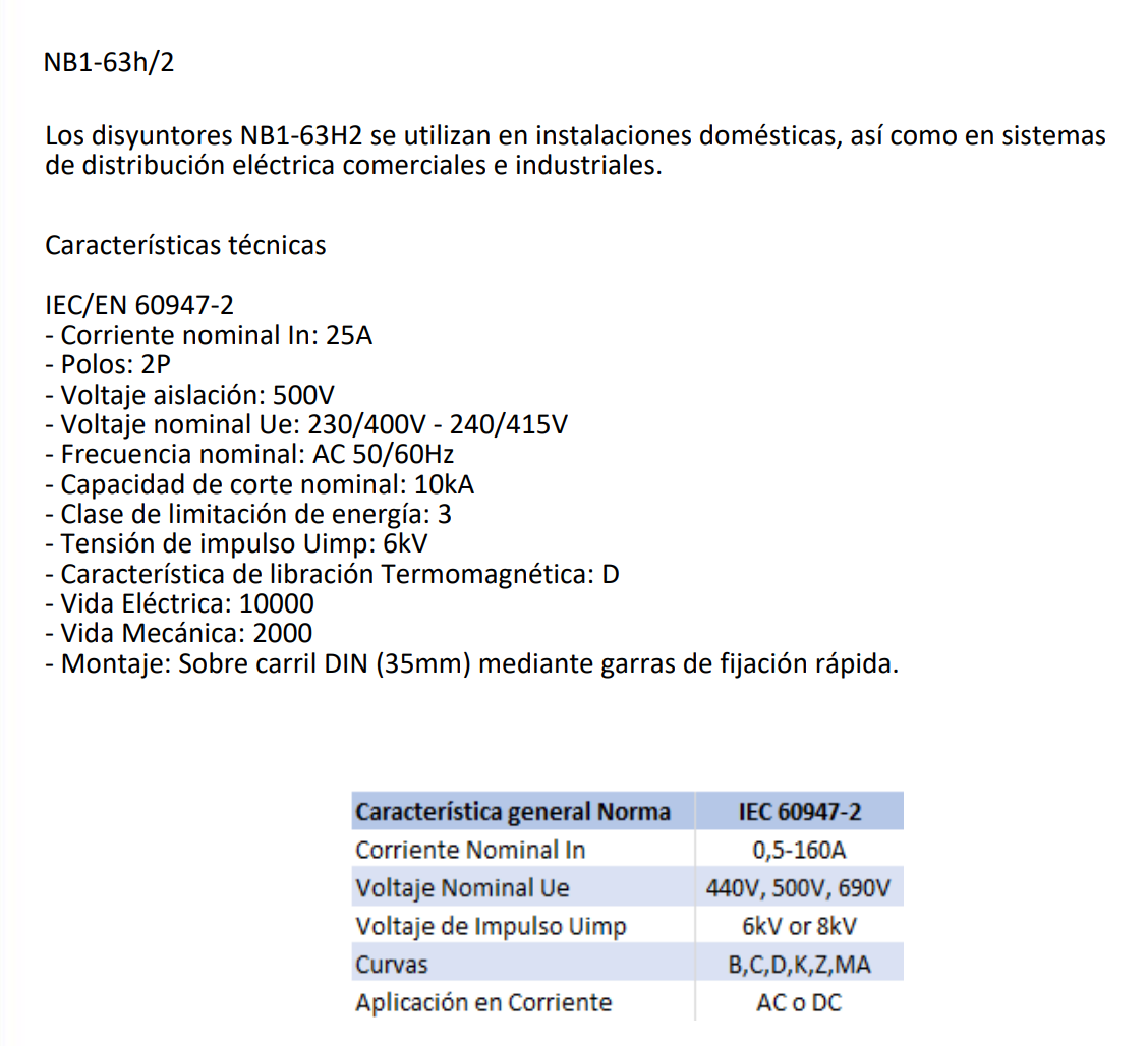 Interruptor industrial CHINT NB1-63H/2 bipolar de 25 A, curva D y capacidad de corte de 10 kA conforme a IEC 60947-2. Diseñado para la protección de circuitos con elevadas corrientes de arranque, proporcionando una respuesta confiable frente a sobrecargas y cortocircuitos en aplicaciones industriales. Montaje en riel DIN.