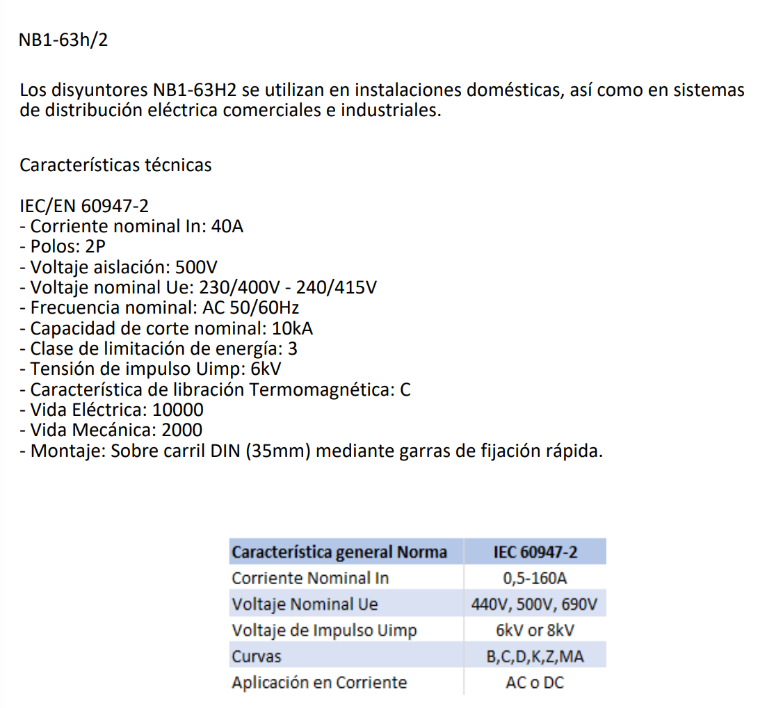 Interruptor automático industrial CHINT NB1-63H/2 bipolar de 40 A, curva C y capacidad de corte de 10 kA. Diseñado para la protección de circuitos eléctricos industriales frente a sobrecargas y cortocircuitos, conforme a la norma IEC 60947-2.