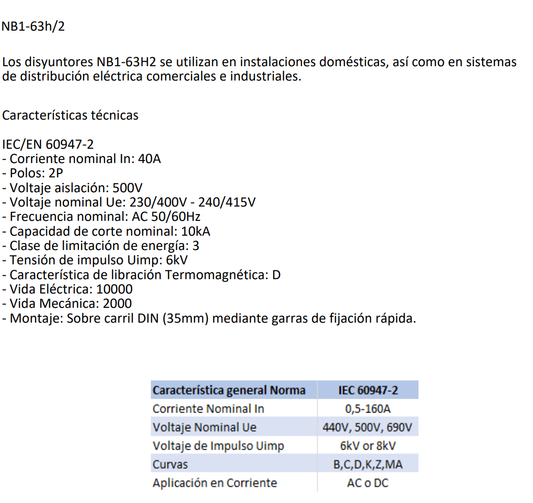 Interruptor industrial CHINT NB1-63H/2 bipolar de 40 A, curva D y capacidad de corte de 10 kA conforme a IEC 60947-2. Diseñado para la protección de circuitos con elevadas corrientes de arranque, ofreciendo una actuación confiable frente a sobrecargas y cortocircuitos en aplicaciones industriales. Montaje en riel DIN.