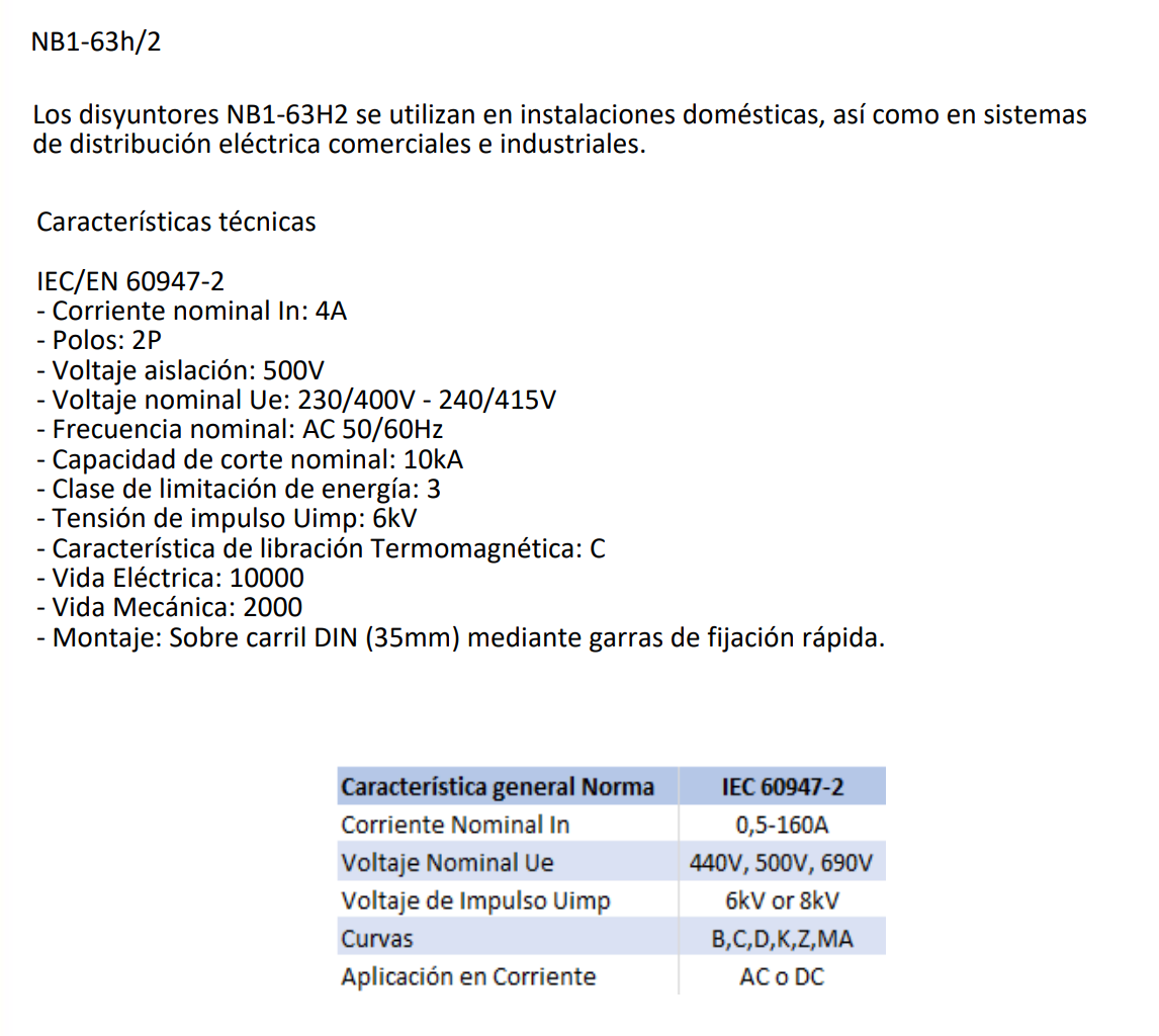 Interruptor automático industrial CHINT NB1-63H/2 bipolar de 4 A, curva C y capacidad de corte de 10 kA. Diseñado para la protección de circuitos eléctricos industriales frente a sobrecargas y cortocircuitos, conforme a la norma IEC 60947-2.