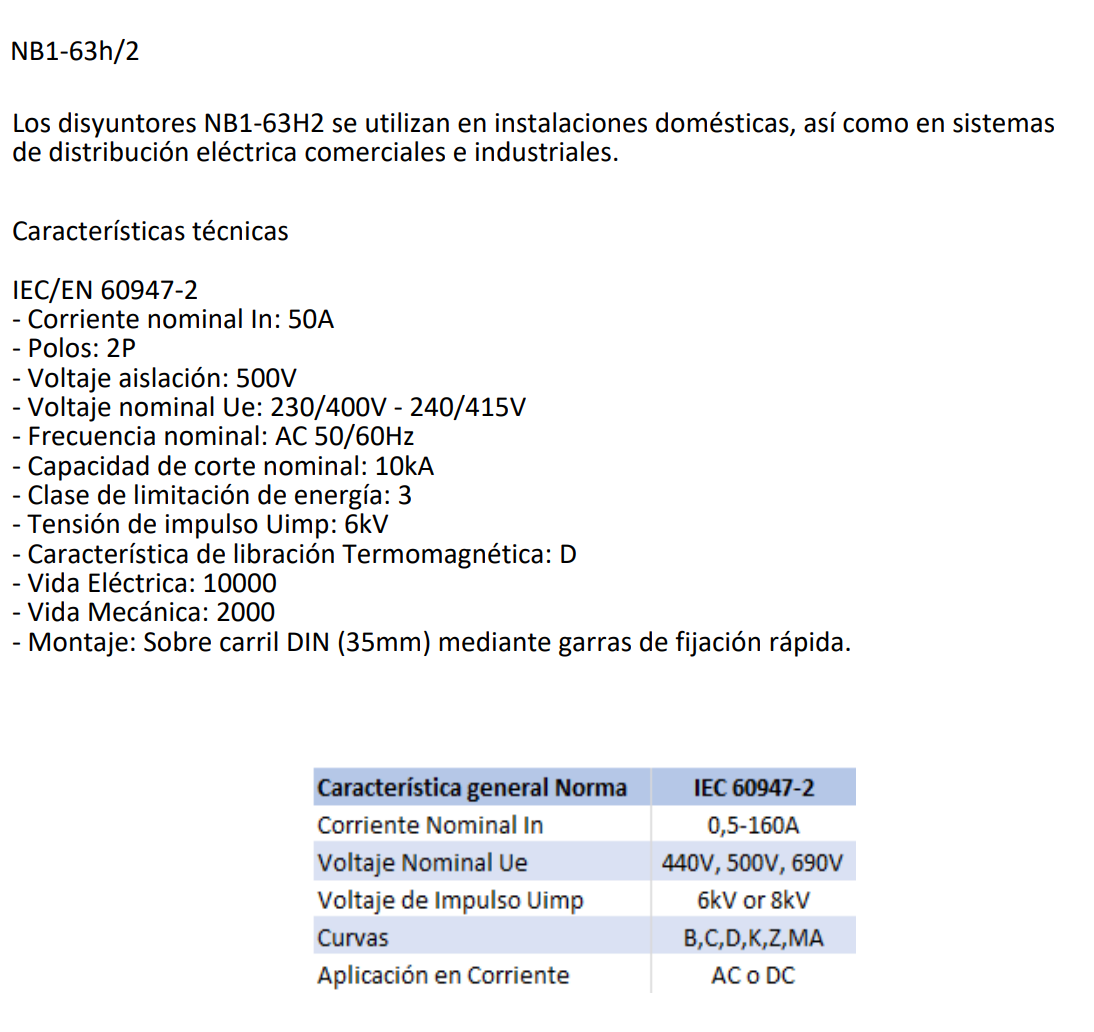 Interruptor industrial CHINT NB1-63H/2 bipolar de 50 A, curva D y capacidad de corte de 10 kA conforme a IEC 60947-2. Diseñado para la protección de circuitos con muy altas corrientes de arranque, proporcionando una actuación confiable frente a sobrecargas y cortocircuitos en aplicaciones industriales exigentes. Montaje en riel DIN.