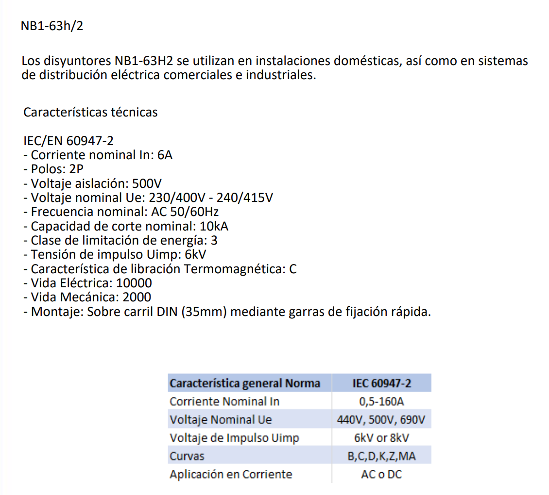 Interruptor automático industrial CHINT NB1-63H/2 bipolar de 6 A, curva C y capacidad de corte de 10 kA. Diseñado para la protección de circuitos eléctricos industriales frente a sobrecargas y cortocircuitos, conforme a la norma IEC 60947-2.