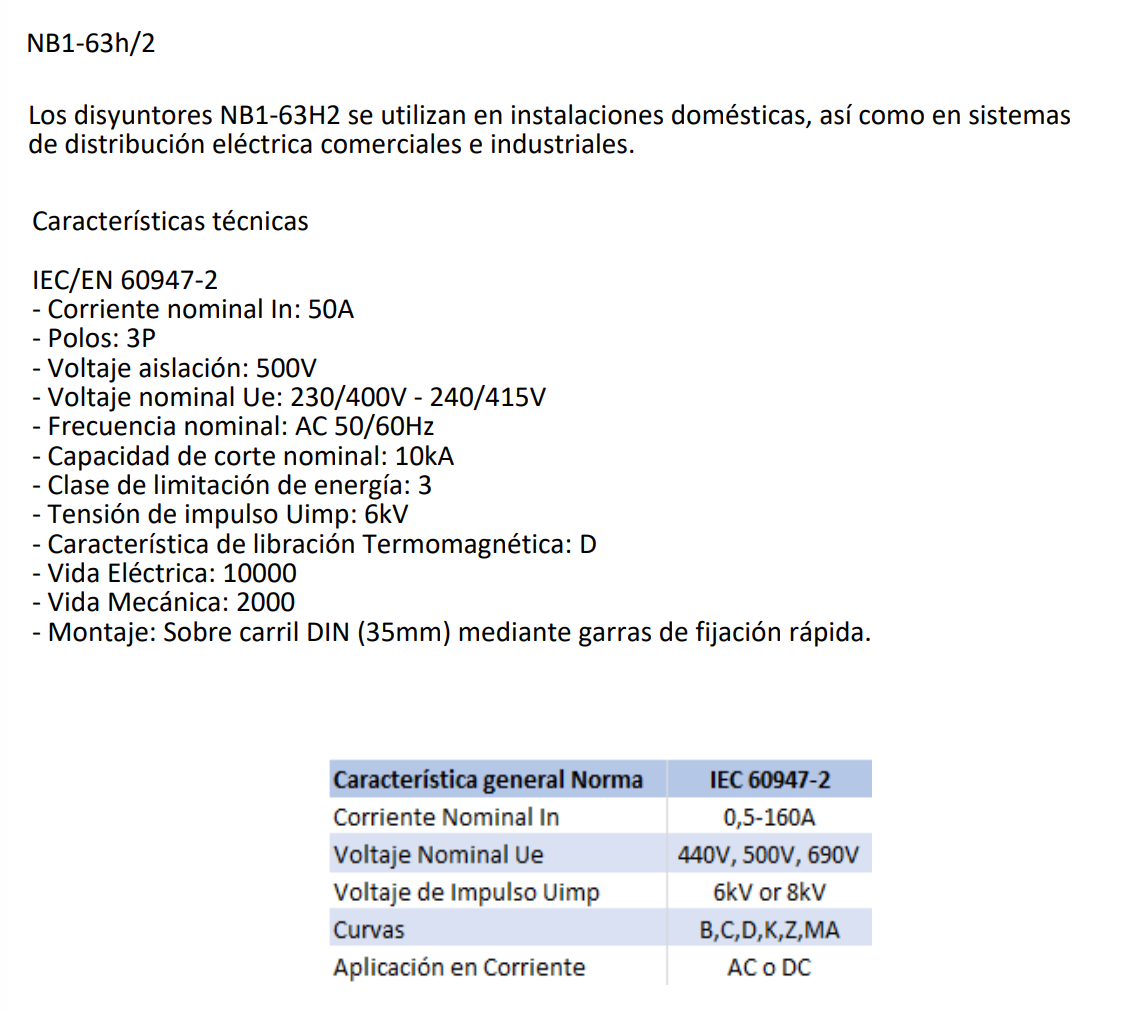 Interruptor termomagnético industrial CHINT NB1-63H/2 tripolar de 50 A, curva D y capacidad de corte de 10 kA. Diseñado para circuitos industriales con corrientes de arranque elevadas, proporcionando protección contra sobrecorrientes y cortocircuitos según la normativa IEC 60947-2.
