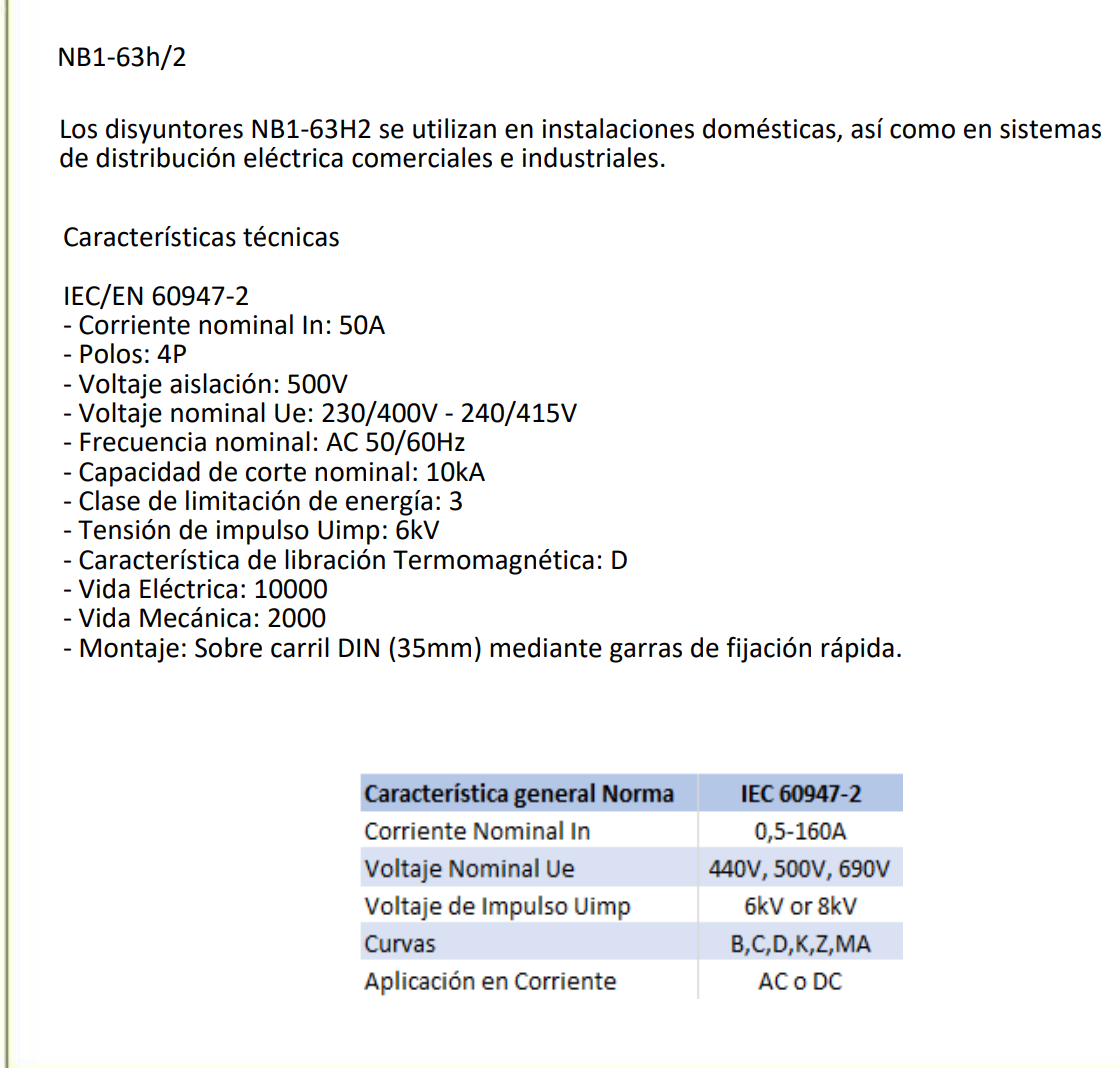 Interruptor industrial CHINT NB1-63H/2 de 4 polos, 50 A y curva D, con capacidad de corte de 10 kA según IEC 60947-2. Diseñado para proteger circuitos en ambientes industriales con altas corrientes de arranque, ofreciendo desconexión confiable ante fallas y cortocircuitos.