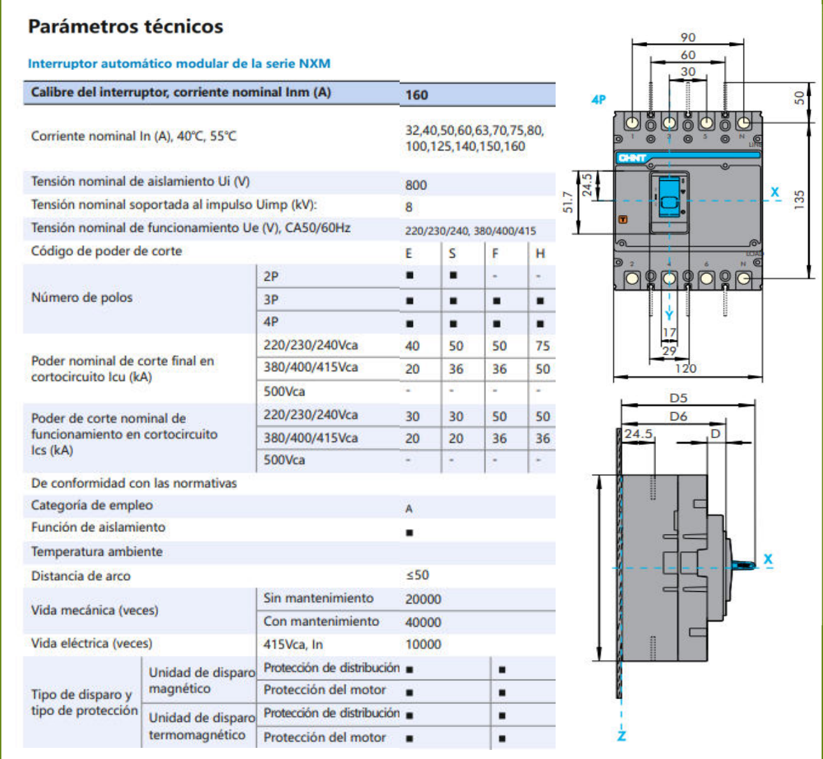 Interruptor MCCB CHINT NXM-160S 4P 150A 36kA Fijo – Código 07212430150CH