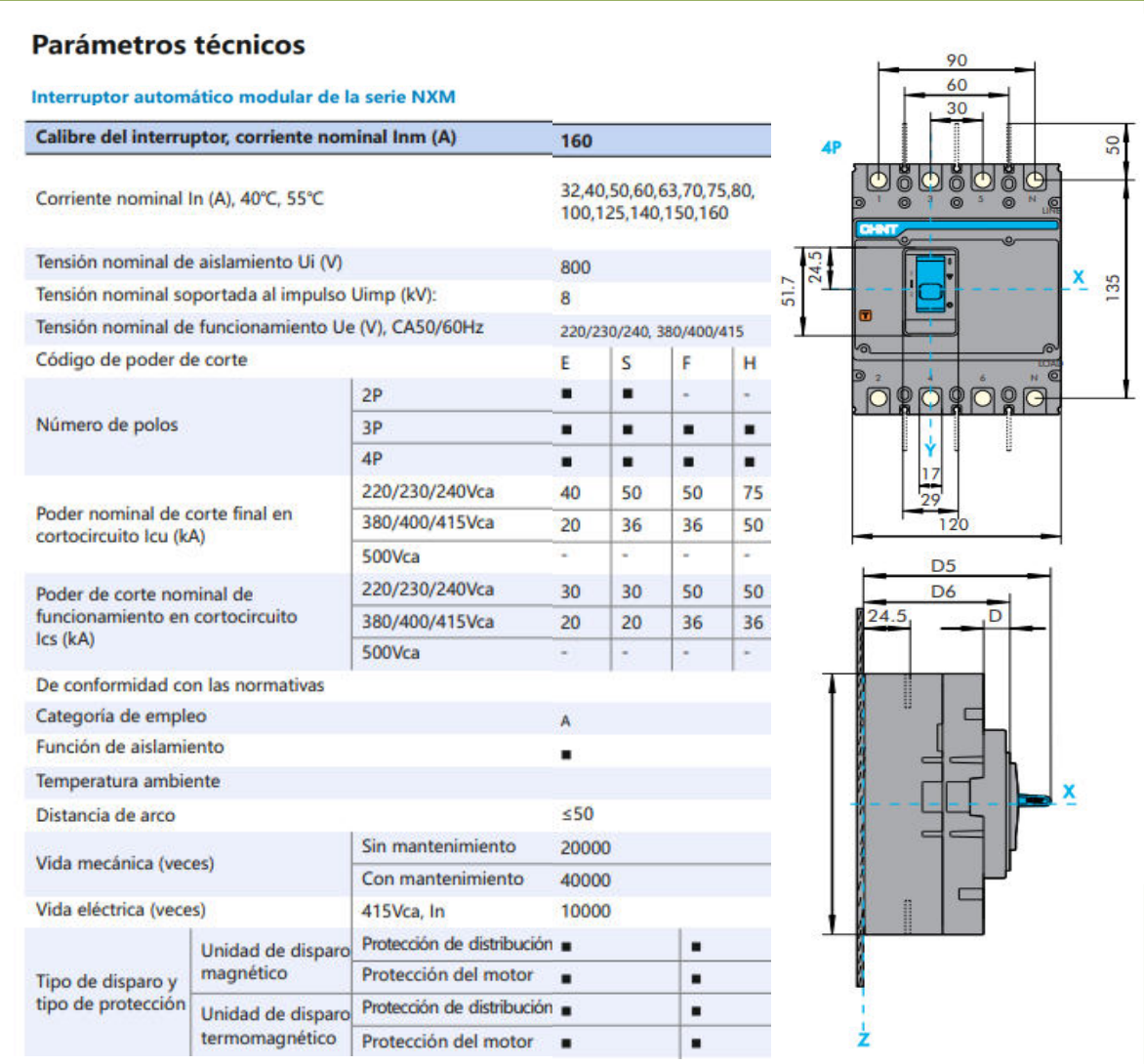 Interruptor MCCB CHINT NXM-160S 4P 160A 36kA Fijo – Código 07212430160CH