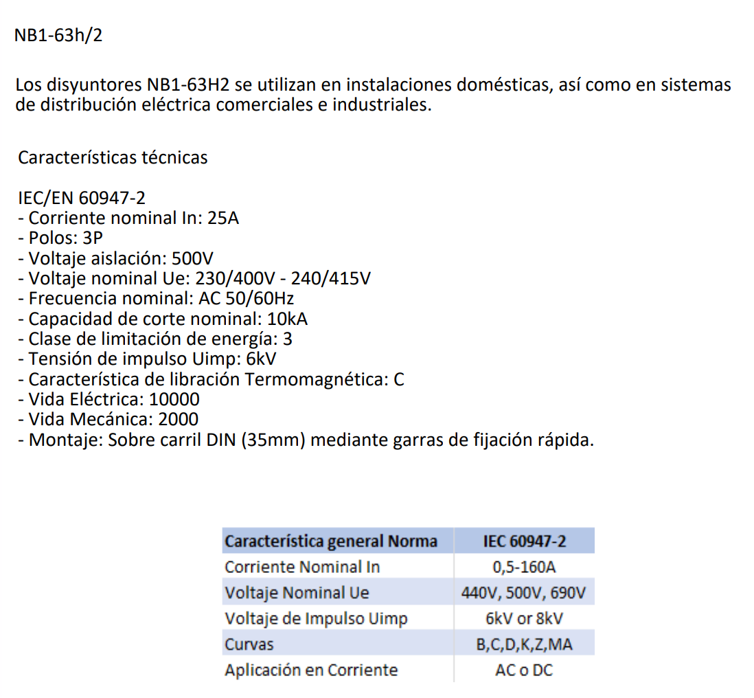 Interruptor automático termomagnético trifásico CHINT NB1-63H/2 con corriente nominal de 25 A, curva de disparo C y capacidad de corte de 10 kA. Proporciona protección contra sobrecargas y cortocircuitos en sistemas eléctricos industriales y comerciales. Cumple la norma IEC/EN 60947-2, con montaje en riel DIN y diseño compacto para tableros de distribución.