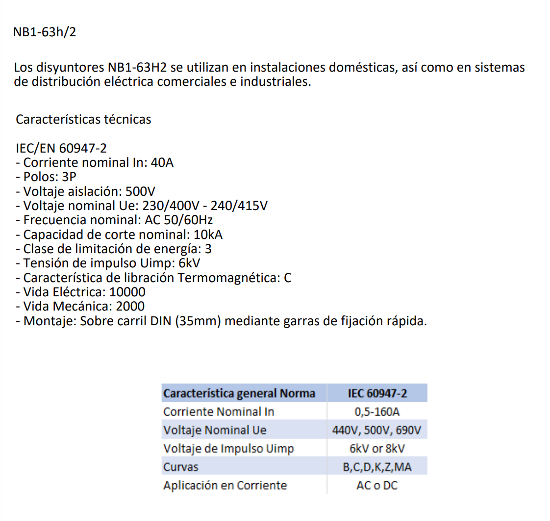 Interruptor automático termomagnético trifásico CHINT NB1-63H/2 de 40 A, curva C y capacidad de corte de 10 kA. Proporciona protección confiable contra sobrecargas y cortocircuitos en sistemas eléctricos industriales y comerciales. Cumple con la norma IEC/EN 60947-2 y se instala fácilmente en riel DIN.