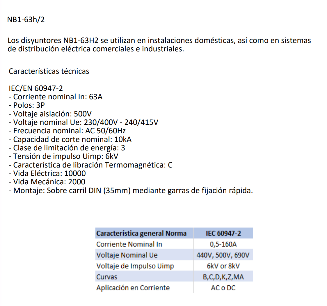 Interruptor automático termomagnético trifásico CHINT NB1-63H/2 con corriente nominal de 63 A, curva C y capacidad de corte de 10 kA. Proporciona protección eficiente contra sobrecargas y cortocircuitos en instalaciones comerciales e industriales. Cumple con IEC/EN 60947-2 y permite montaje en riel DIN.