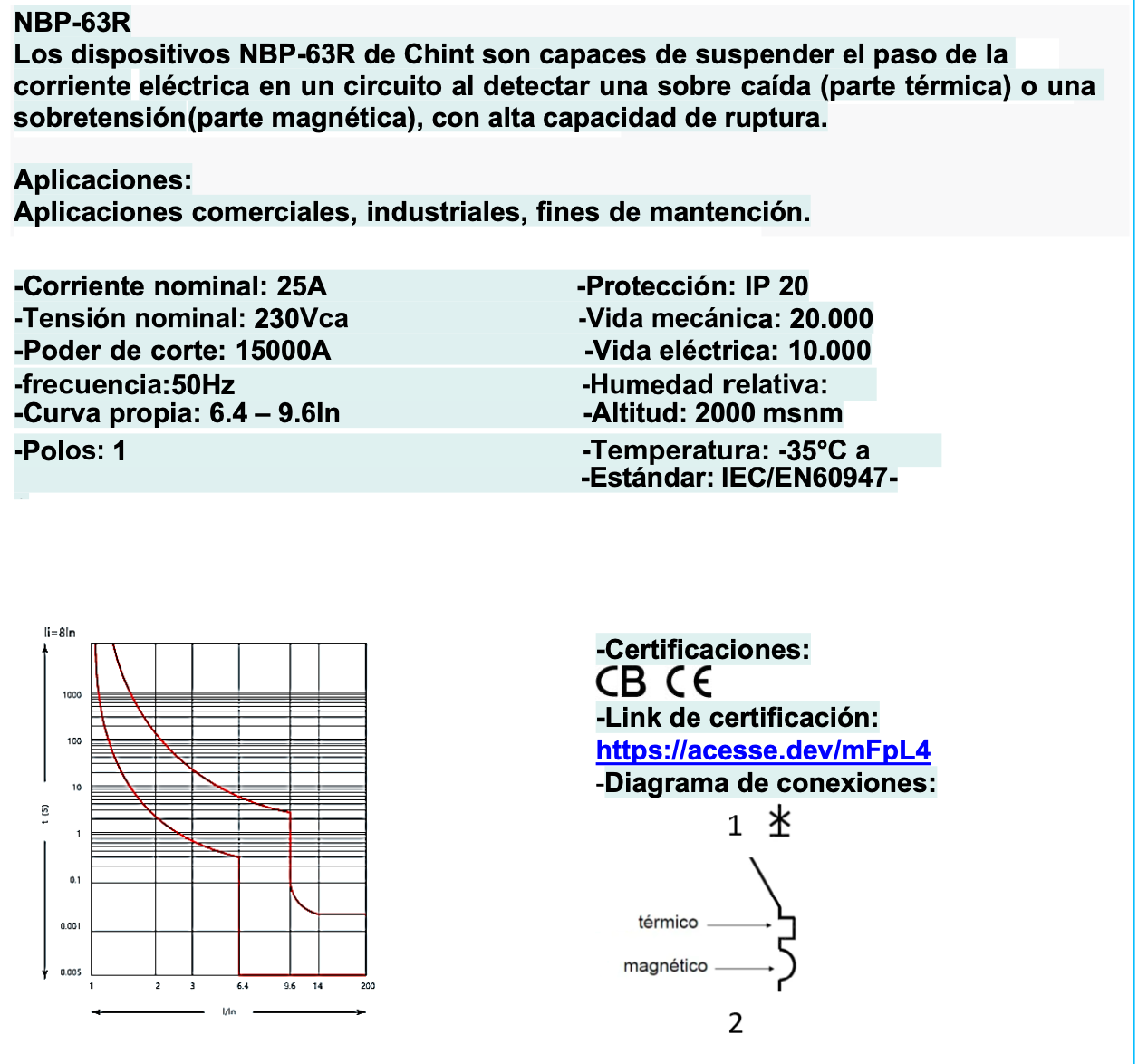 Interruptor termomagnético CHINT NBP-63R monopolar de 25 A, curva C y capacidad de corte de 15 kA. Diseñado para protección de circuitos eléctricos contra sobrecargas y cortocircuitos en aplicaciones industriales y comerciales, con montaje en riel DIN y cumplimiento de norma IEC 60947-2.