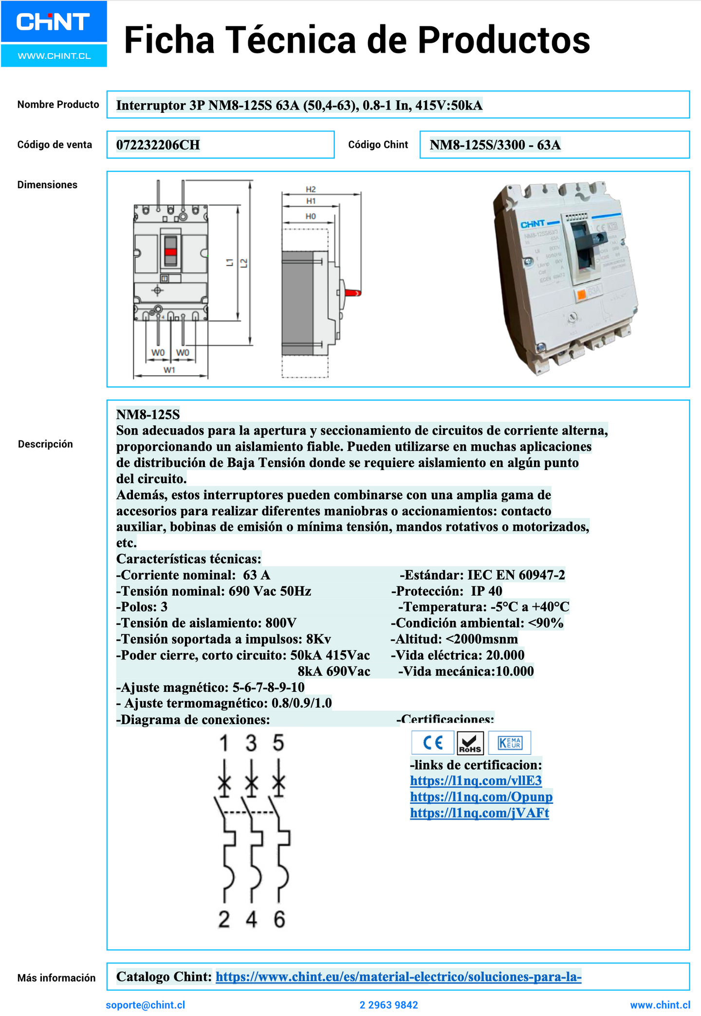 Interruptor termomagnético CHINT NM8-125S tripolar de 63 A, rango ajustable 50,4–63 A, 0,8–1 In y capacidad de corte de 50 kA a 415 V. Diseñado para proteger instalaciones eléctricas frente a sobrecargas y cortocircuitos, cumpliendo norma IEC/EN 60947-2 y certificado CE.