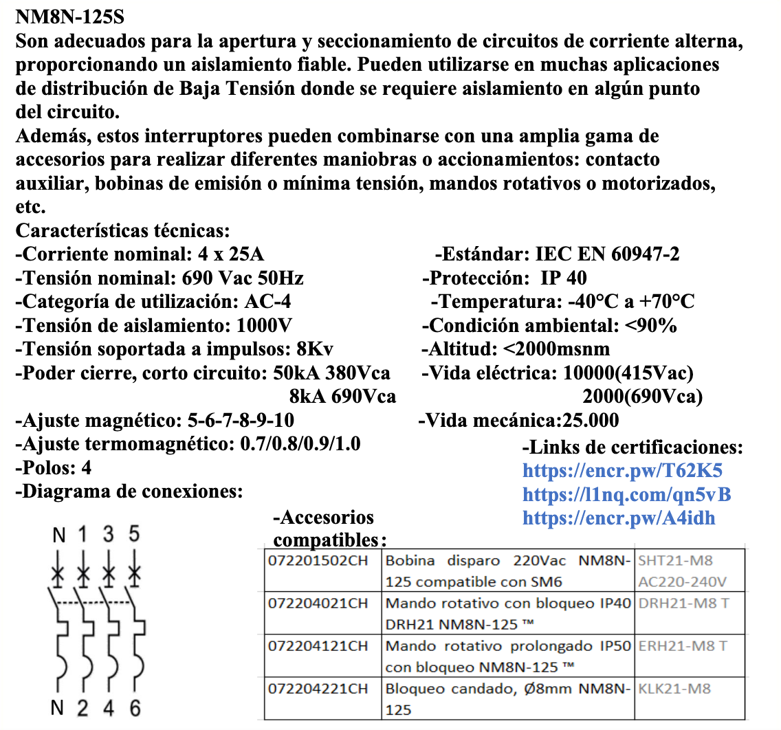 Interruptor termomagnético CHINT NM8N-125C tetrapolar de 25 A, con ajuste de 18–25 A y capacidad de corte de 36 kA a 415 V. Brinda protección efectiva frente a sobrecargas y cortocircuitos en instalaciones eléctricas residenciales, comerciales e industriales.
