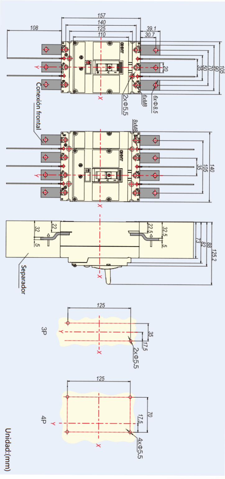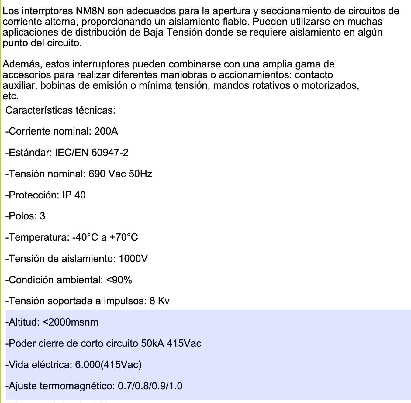 Interruptor termomagnético CHINT NM8N-250S tripolar de 200 A, con ajuste térmico 0,7–1 In y capacidad de corte de 50 kA a 415 V. Proporciona protección confiable contra sobrecargas y cortocircuitos en instalaciones industriales, cumpliendo normativa IEC/EN 60947-2.