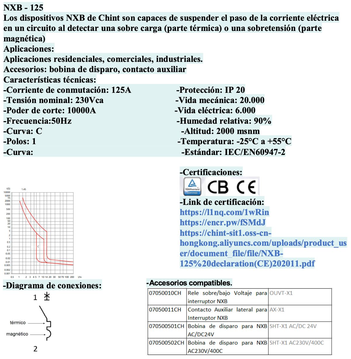 Interruptor termomagnético CHINT NXB-125H unipolar de 125 A con curva C y capacidad de corte de 10 kA. Diseñado para proteger circuitos eléctricos contra sobrecargas y cortocircuitos cumpliendo normas IEC/EN 60898-1, con instalación sencilla en riel DIN.