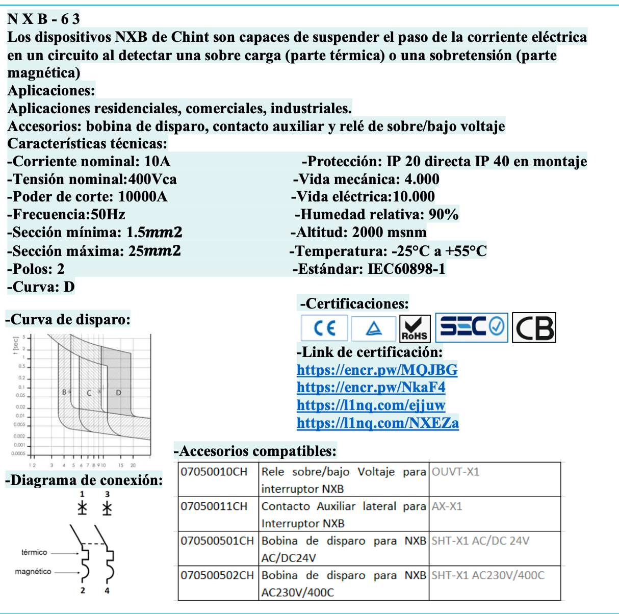 Interruptor termomagnético CHINT NXB-63H bipolar de 10 A, curva D y capacidad de corte de 10 kA. Diseñado para la protección de circuitos eléctricos frente a sobrecargas y cortocircuitos, especialmente en aplicaciones con altas corrientes de arranque. Producto con certificación SEC, apto para instalaciones eléctricas reguladas.