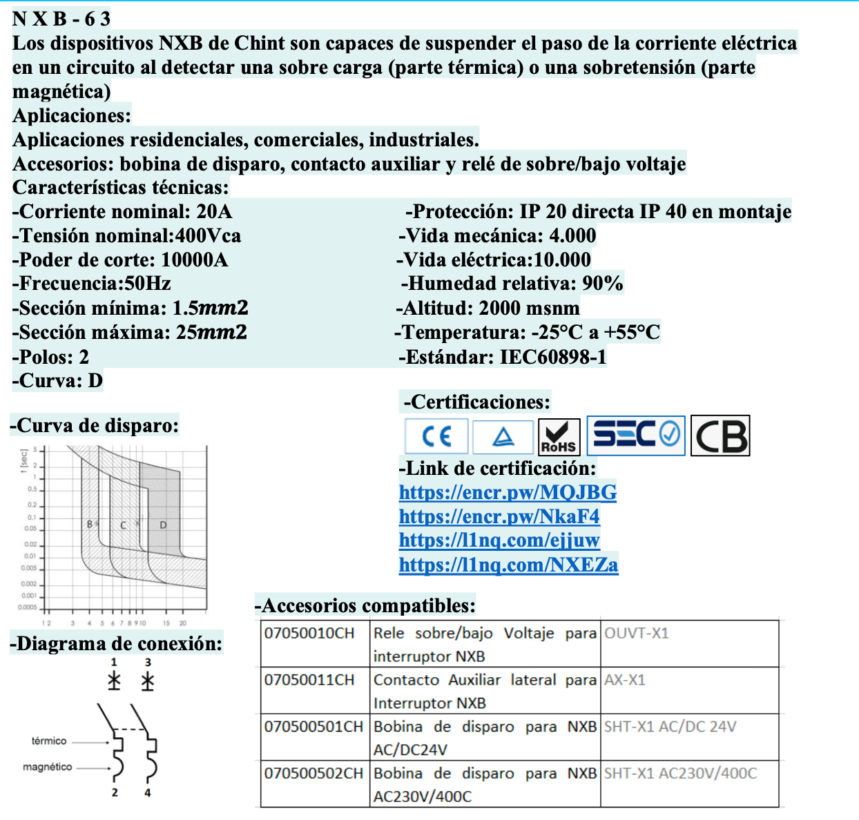 Interruptor termomagnético CHINT NXB-63H bipolar de 20 A, curva D y capacidad de corte de 10 kA. Diseñado para la protección de circuitos eléctricos frente a sobrecargas y cortocircuitos en aplicaciones con altas corrientes de arranque. Producto con certificación SEC, apto para instalaciones eléctricas reguladas.