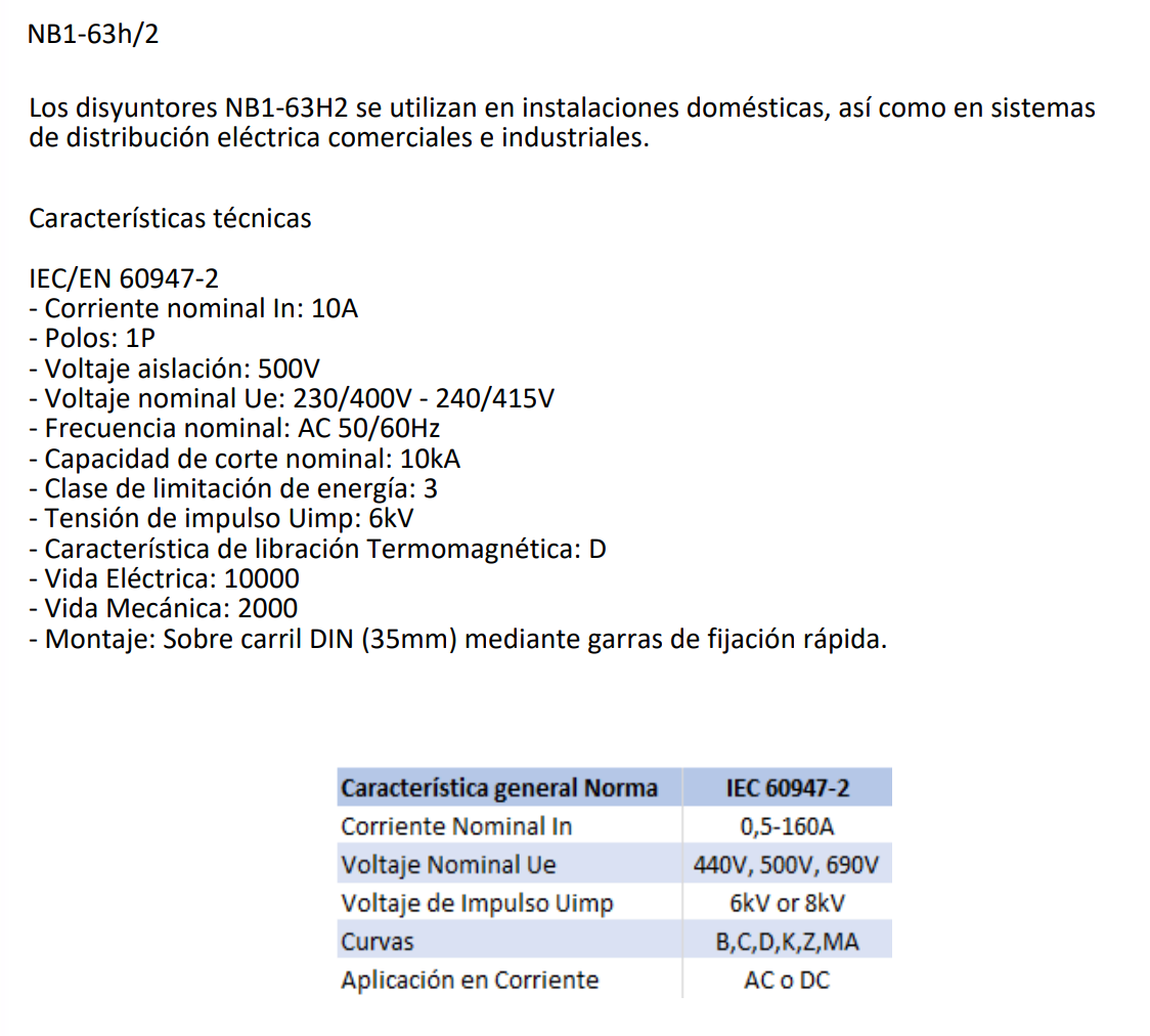 Interruptor termomagnético industrial CHINT serie NB1-63H de 1 polo, corriente nominal de 10 A y curva de disparo D (rango de disparo magnético 10-14 In). Especialmente diseñado para la protección de cargas inductivas con altas corrientes de arranque, como motores o transformadores. Cuenta con una capacidad de ruptura de 10 kA cumpliendo estrictamente la normativa IEC/EN 60947-2.