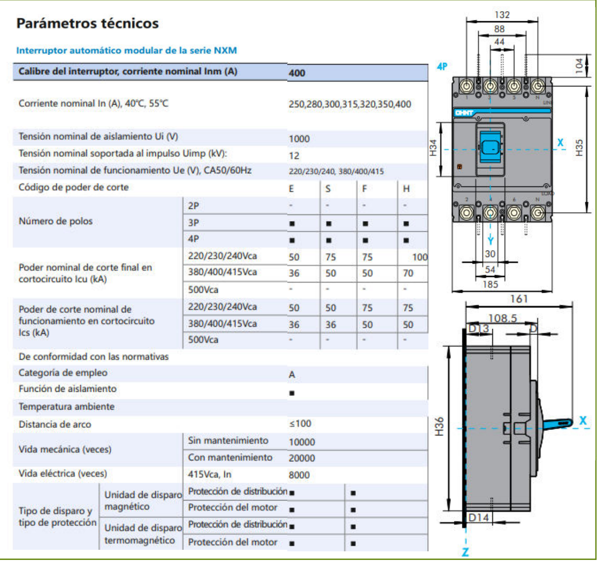 Interruptor Termomagnético MCCB Fijo NXM-400S 4P 320 A 50 kA – Código 07212430320CH
