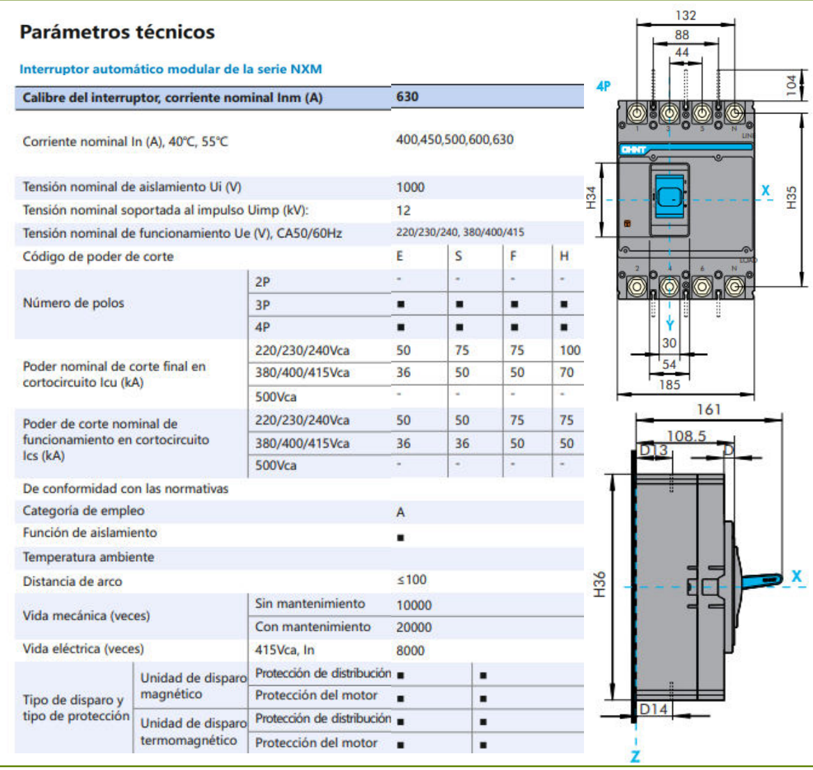 Interruptor termomagnético MCCB fijo NXM-630S de 4 polos y 500 A, con capacidad de corte de 36 kA. Diseñado para protección de instalaciones eléctricas industriales, contra sobrecargas y cortocircuitos de alta corriente, cumpliendo normativa IEC/EN 60947-2.