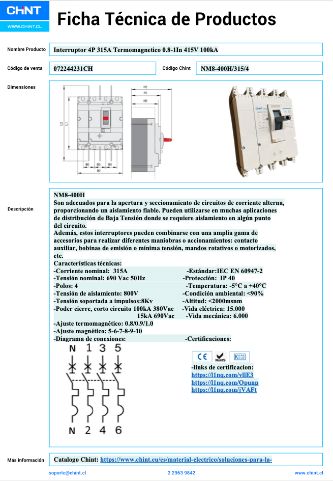 Interruptor termomagnético MCCB NM8-400H de 4 polos y 315 A, con capacidad de corte de 100 kA a 415 V. Ofrece protección eficaz contra sobrecargas y cortocircuitos en instalaciones de alta potencia, ajustable en rango térmico de 0,8–1 In, según norma IEC/EN 60947-2.