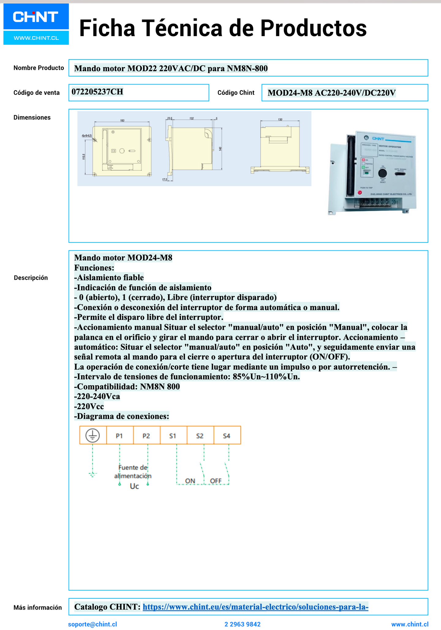 Mando motor CHINT MOD22 compatible con interruptores NM8N-800, operable en 220 V AC/DC. Permite controlar y accionar de forma segura el interruptor, asegurando la correcta operación de motores en instalaciones eléctricas industriales.