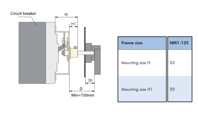 Mando rotativo prolongado CHINT para interruptores automáticos NM1-125 en configuración tripolar. Permite la operación externa del interruptor mediante mecanismo rotativo, facilitando maniobra segura desde la puerta del tablero.