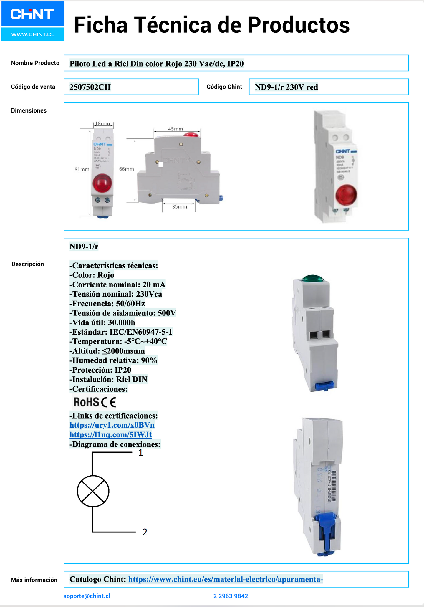 Piloto LED Montaje Riel DIN CHINT ND9‑1/R Rojo 230 VAC/DC 20 mA – Código 2507502CH
