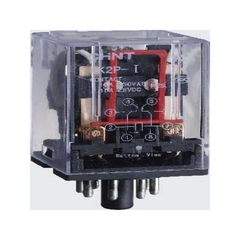 Relé encapsulado CHINT de 8 pines, 220 VAC, con 2 contactos conmutados (NA/NC) y capacidad de 10 A. Ideal para aplicaciones de automatización y control industrial.