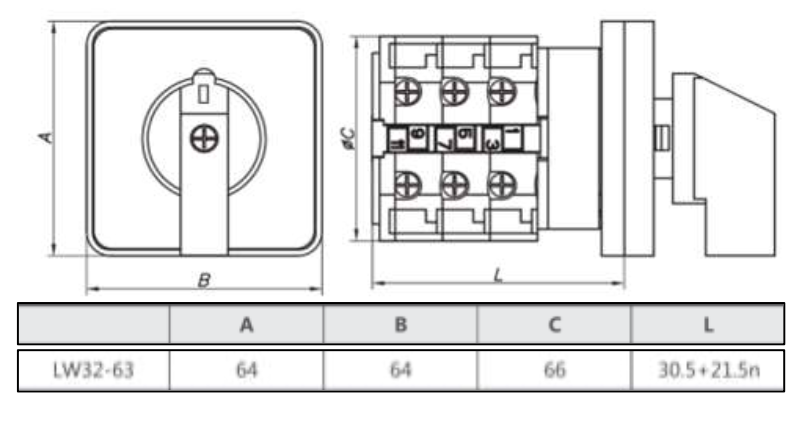 El seccionador rotativo CHINT LW32-63/C04/2 es un interruptor manual de 2 polos y 63 A (AC-1) con 2 posiciones (0-1), utilizado para la conmutación y seccionamiento de circuitos eléctricos. Su diseño compacto de 65x65 mm permite instalación en panel y garantiza operación confiable en sistemas industriales o de control.