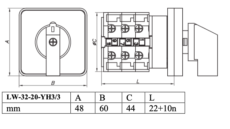 Selector Amperimétrico CHINT LW32-20-LH3/3 3 Fases 4 Hilos 4 Posiciones 60×48 mm – Código 27033443CH