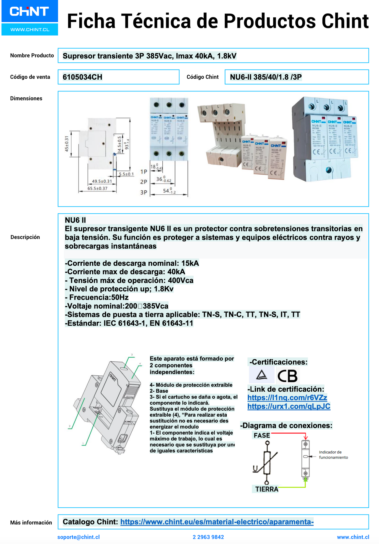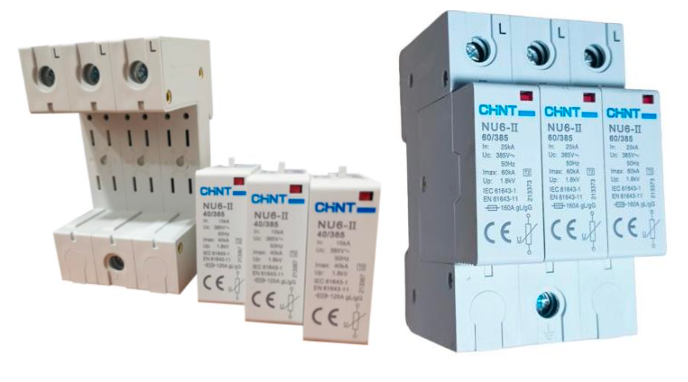 SPD CHINT serie NU6‑Ⅱ trifásico con tensión continua operativa de 385 VAC y capacidad de descarga máxima de 40 kA (8/20 µs), nivel residual típico de 1.8 kV. Diseñado para montajes modulares sobre riel DIN con módulo reemplazable e indicador visual del estado. Cumple norma IEC/EN 61643‑11, ideal para protección contra sobretensiones transitorias en sistemas eléctricos trifásicos.