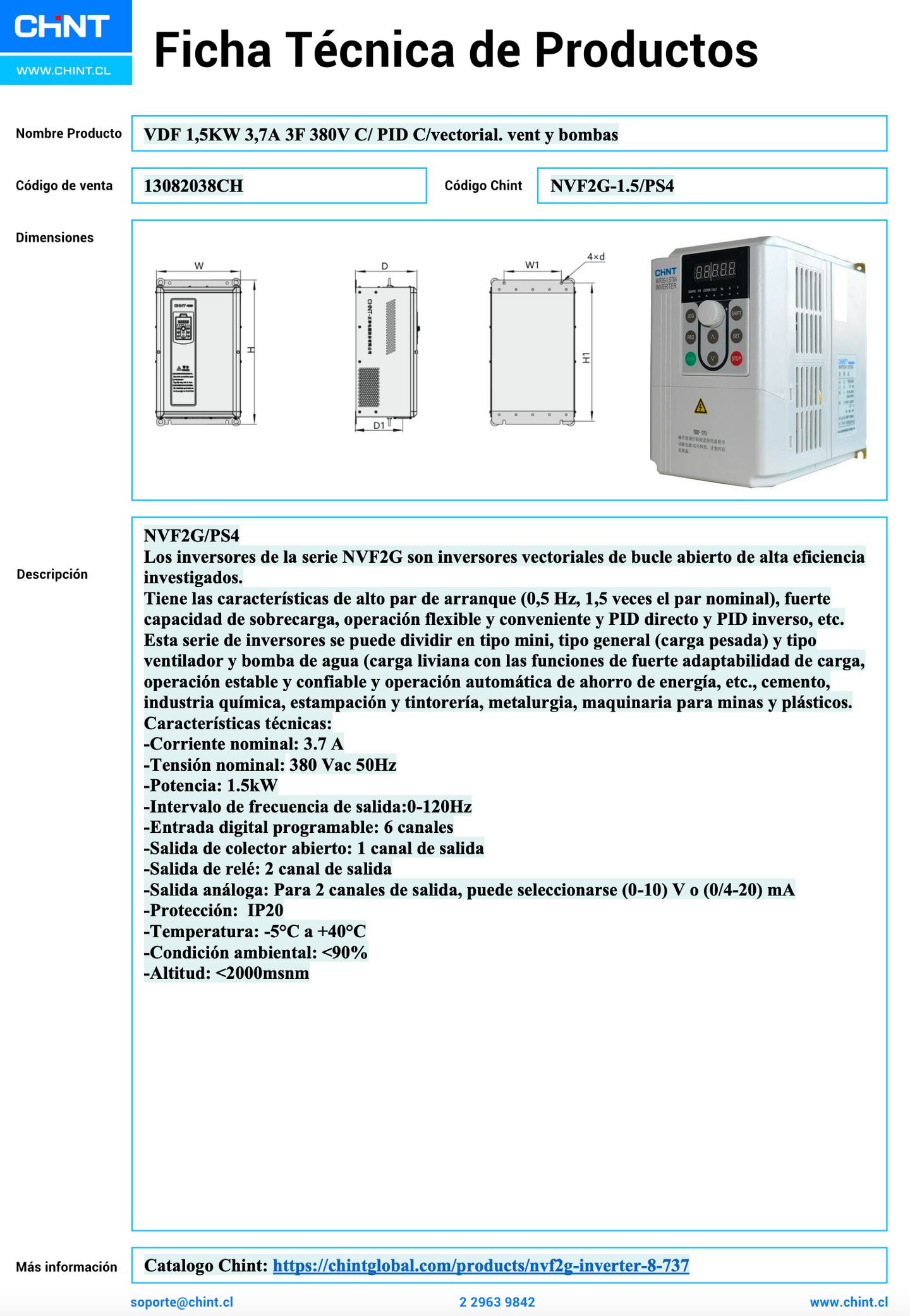 Variador de frecuencia CHINT NVF2G-1.5/PS4 trifásico de 1,5 kW y 3,7 A, tensión de entrada 380 V. Incorpora control vectorial y función PID integrada, diseñado para aplicaciones en ventiladores y bombas.